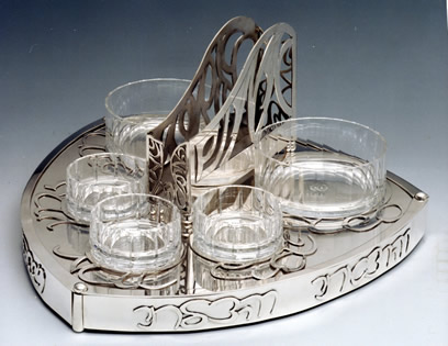 The dishes are designed to hold the relative quantities of condiments needed at the Seder, with the position of each dish labeled in decorative script.