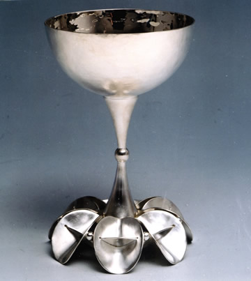 Sinking is a technique whereby a disc of sheet metal is hammered with a ball-peen hammer against a depression in a wooden stump. Blows are closely delivered in a spiral direction, from the outside towards the center. When the metal hardens, it is annealed, then the process repeated. Eventually one obtains a bowl, as in the Spertus kiddush cup, shown here.